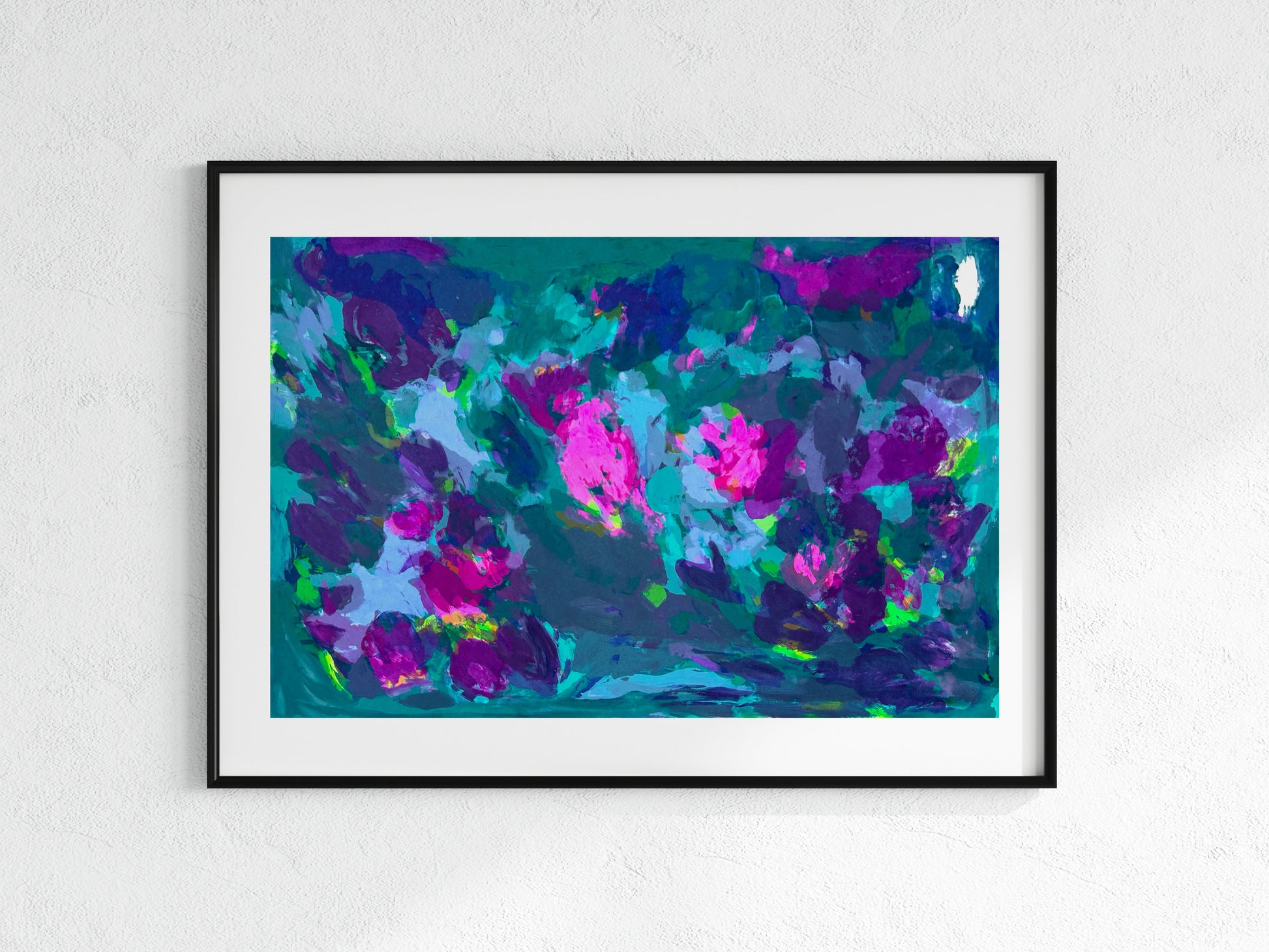 Marie’s series of mono-screen prints are done very freely, in search of creating interesting fluidity between colours and textures. Due to the nature of “Monoprinting”, which allows you to only create one-off fine art printing, this is a one of a kind artwork.